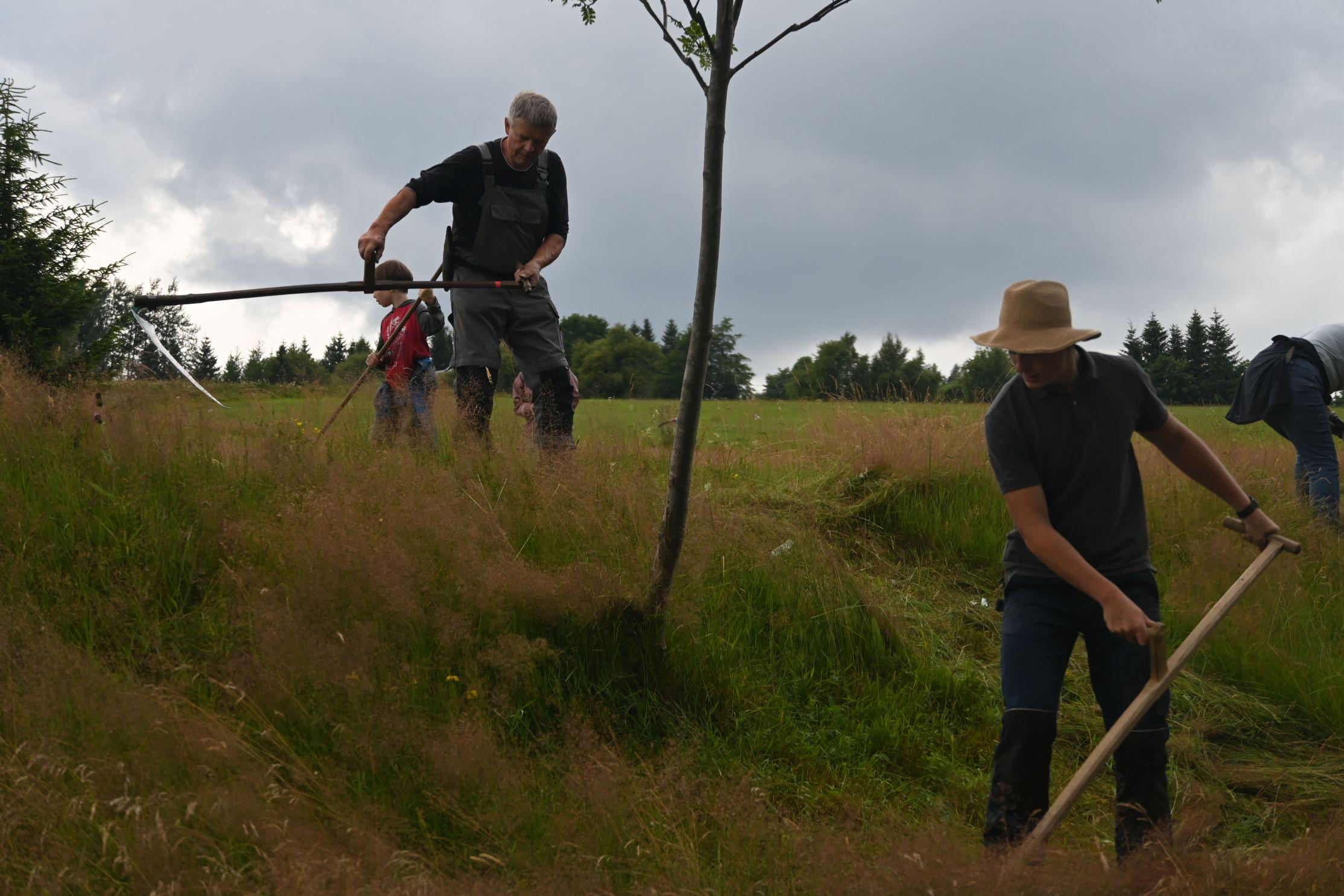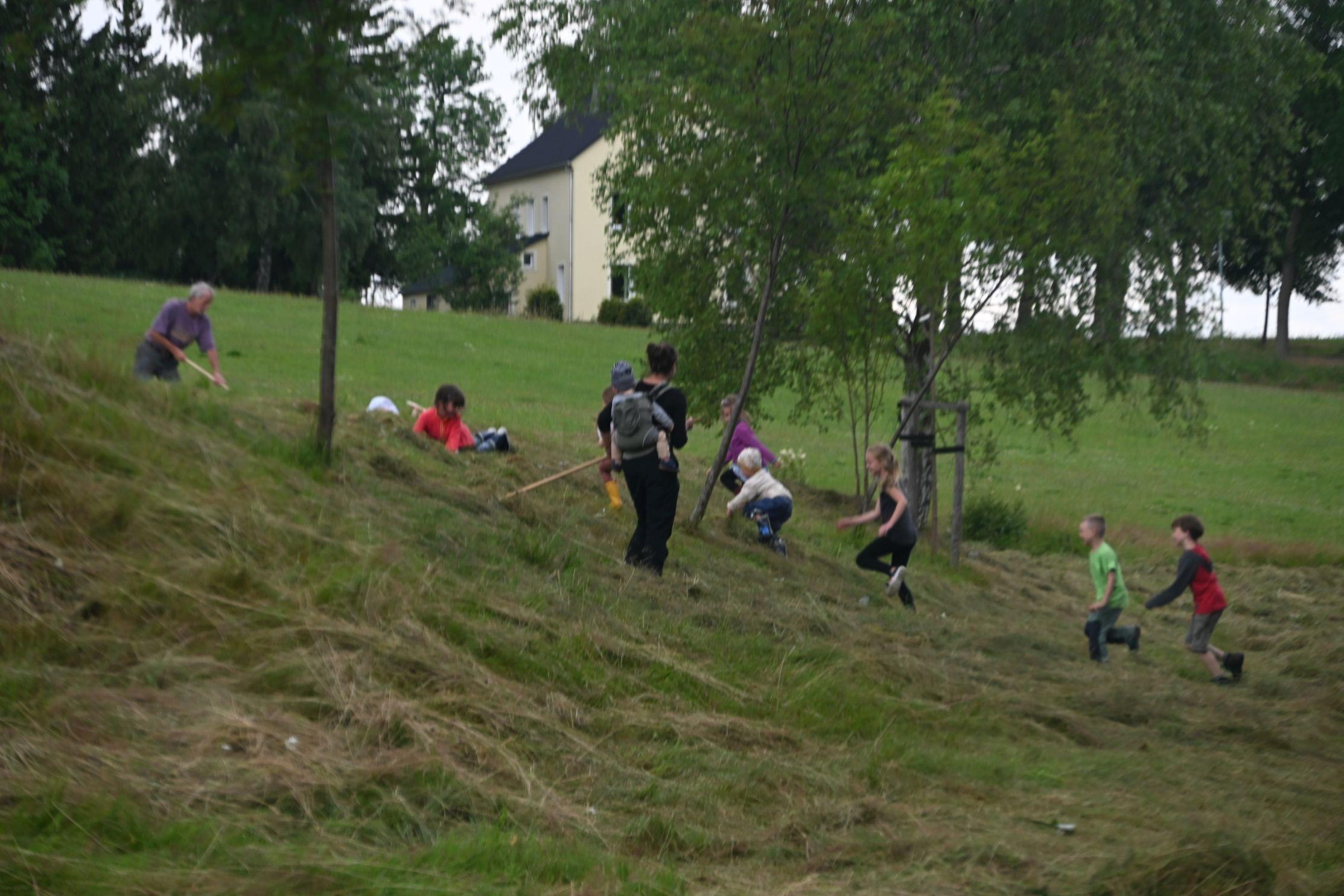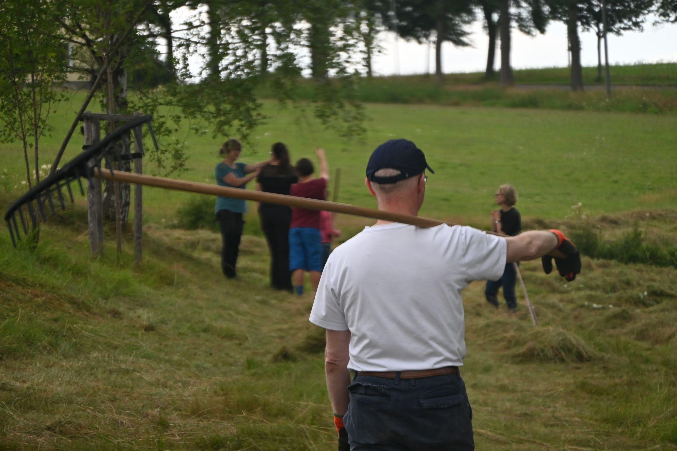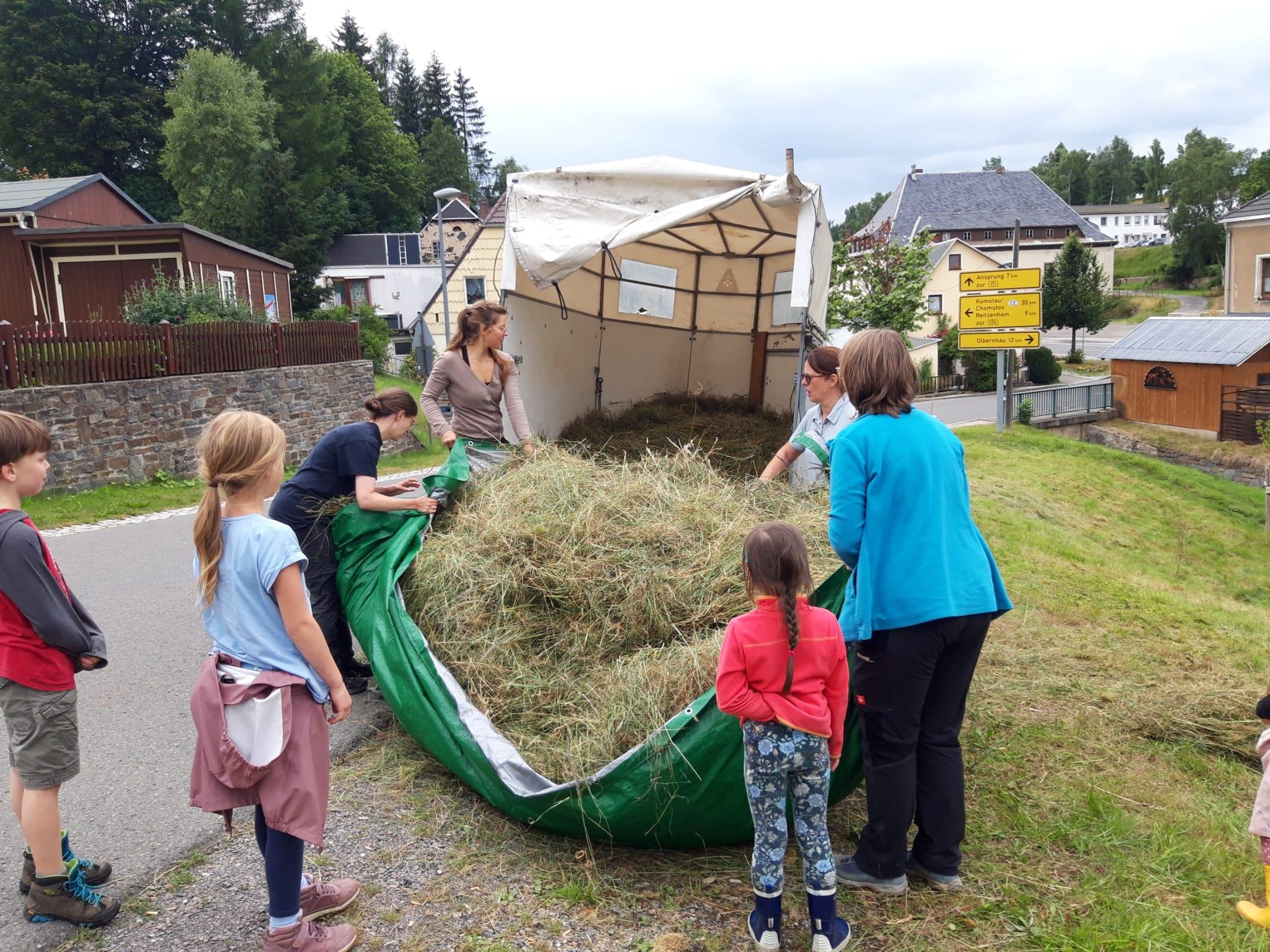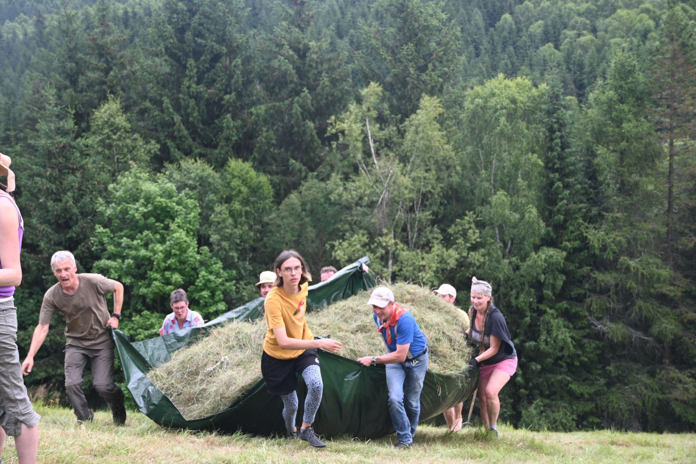 Wir danken den vielen Helferinnen und Helfern, die uns in diesem Jahr bei der Heuernte auf den Rübenauer Bergwiesen vom 14.07.-20.7.2025 unterstützt haben! Bei überwiegend durchwachsenem Wetter war es trotz der engagierten Beteiligung leider nicht möglich, alle Flächen wie in den Vorjahren zu bearbeiten. Dennoch entstanden durch den fleißigen Einsatz wieder etliche Heuballen, die inzwischen erfolgreich an Pferdebesitzer abgegeben werden konnten. Letztlich sind die (Wieder-)Begegnungen sowie der Austausch unter den naturinteressierten Teilnehmenden genauso wichtig wie die Heu-Ernteerträge. Wir genossen zudem eine leckere vegetarische Versorgung durch Ina Hoyer (Peacefood Chemnitz), eine Exkursion ins benachbarte Tschechien sowie in Heiners Drechselwerkstatt und freuten uns über ein musikalisches Highlight am Lagerfeuer beim Konzert von Heiner Stephani. Alle Interessierten sind auch im kommenden Jahr wieder eingeladen, uns bei freier Kost und Logis bei der Heuernte zu unterstützen: