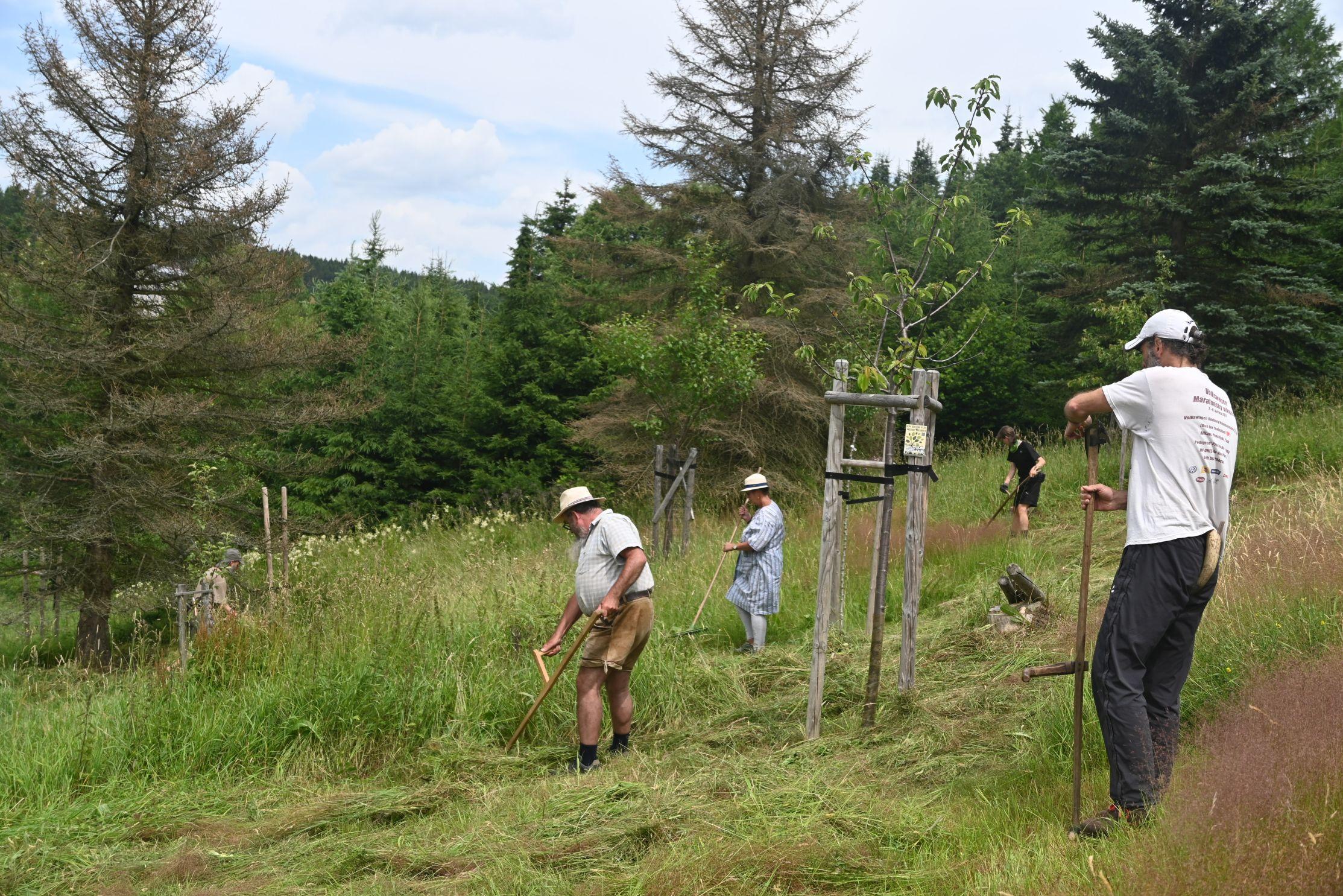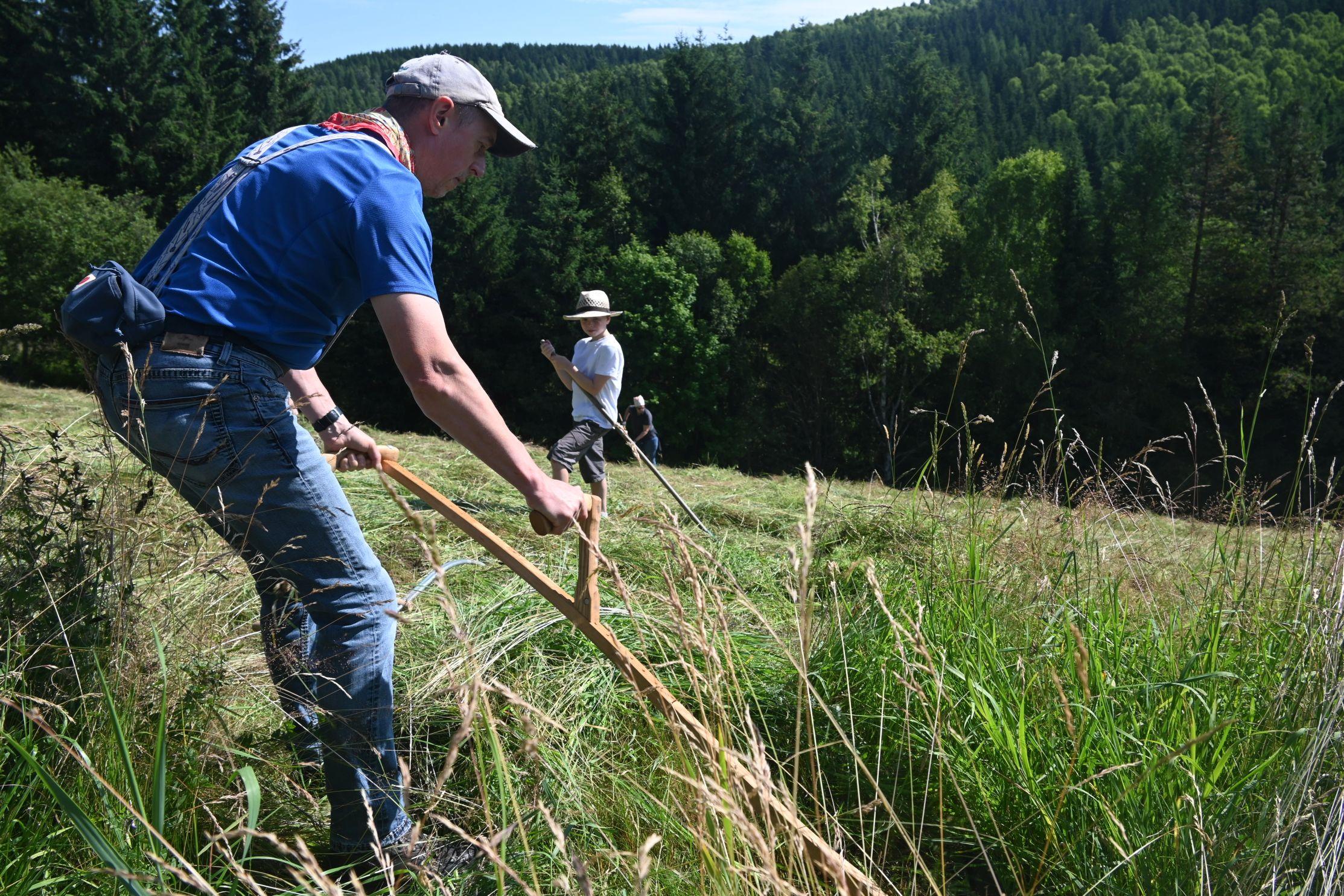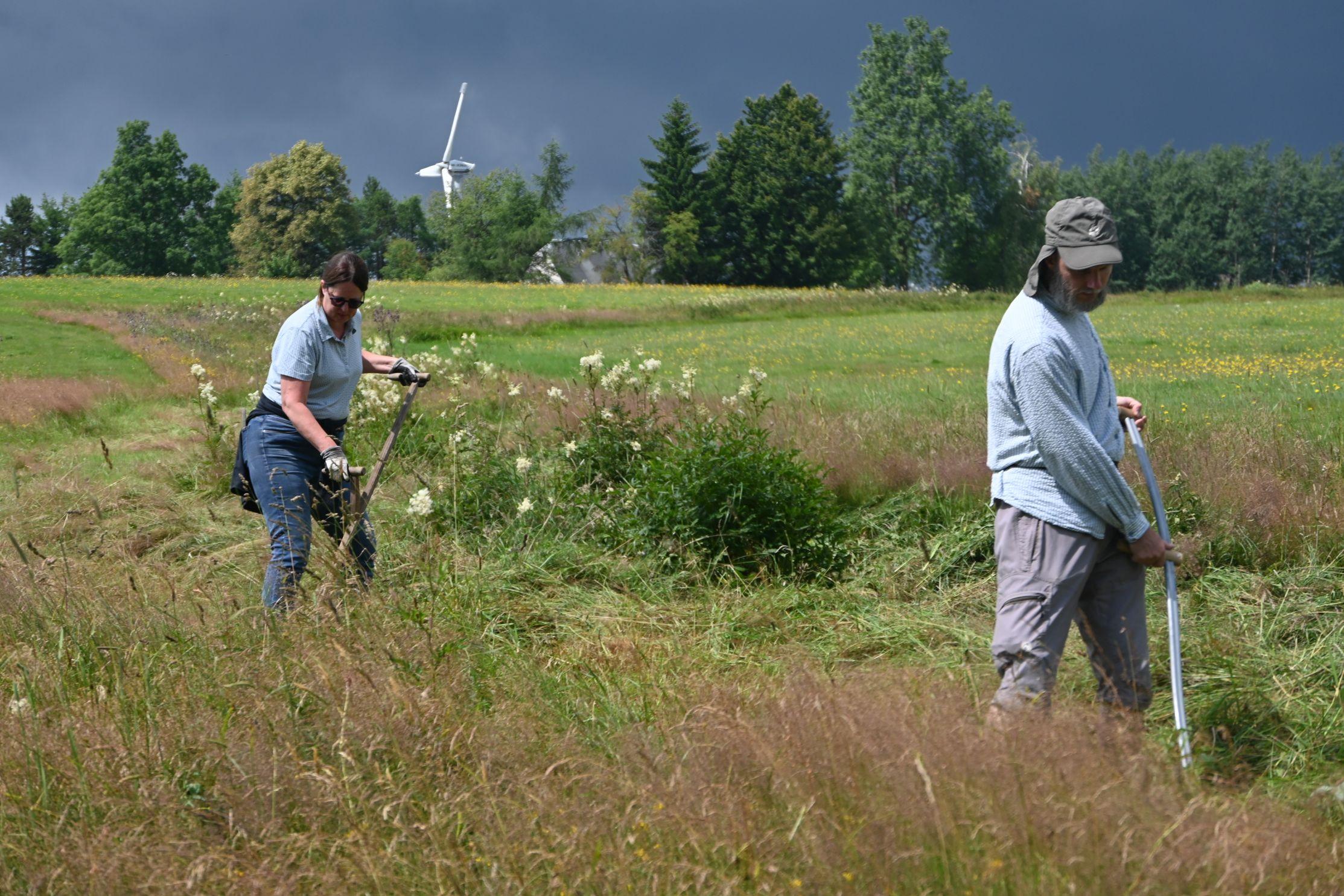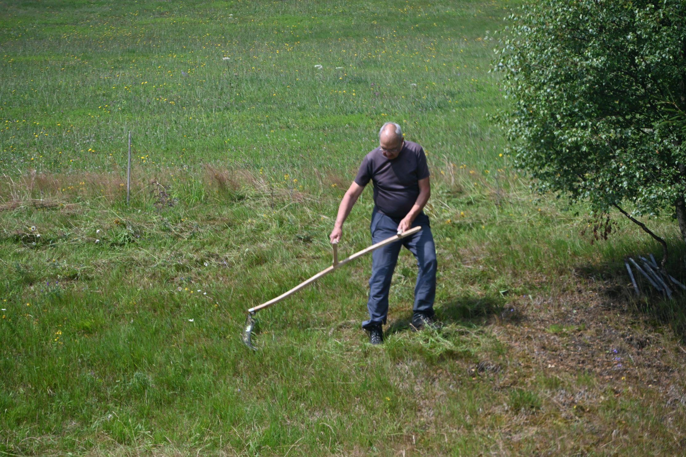 Wir danken den vielen Helferinnen und Helfern, die uns in diesem Jahr bei der Heuernte auf den Rübenauer Bergwiesen vom 14.07.-20.7.2025 unterstützt haben! Bei überwiegend durchwachsenem Wetter war es trotz der engagierten Beteiligung leider nicht möglich, alle Flächen wie in den Vorjahren zu bearbeiten. Dennoch entstanden durch den fleißigen Einsatz wieder etliche Heuballen, die inzwischen erfolgreich an Pferdebesitzer abgegeben werden konnten. Letztlich sind die (Wieder-)Begegnungen sowie der Austausch unter den naturinteressierten Teilnehmenden genauso wichtig wie die Heu-Ernteerträge. Wir genossen zudem eine leckere vegetarische Versorgung durch Ina Hoyer (Peacefood Chemnitz), eine Exkursion ins benachbarte Tschechien sowie in Heiners Drechselwerkstatt und freuten uns über ein musikalisches Highlight am Lagerfeuer beim Konzert von Heiner Stephani. Alle Interessierten sind auch im kommenden Jahr wieder eingeladen, uns bei freier Kost und Logis bei der Heuernte zu unterstützen: